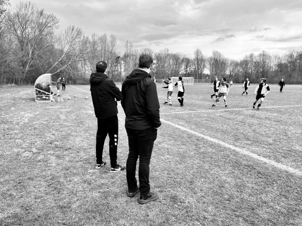 Groen Geel lijkt het in de breedte (vul in zoals u wilt) beter voor elkaar te hebben. Toch wordt ook daar kort na Koert zijn capitulatie al bij de bank geïnformeerd ‘of er nog iemand fit is’. Vanuit onze ooghoek zien we 5 handen de lucht in schieten, wat de vraag vanuit het veld een retorische nasmaak geeft. Verder onttrekt zich een evenwichtig wedstrijdbeeld. Na wat discussie over de kansverhoudingen die neigt naar het expected goal syndrome waaraan ‘het voetbal’ onderhevig lijkt, concludeert afzwaaiend teammanager Nico a.k.a. Raio dat het dus gewoon 0-0 staat.