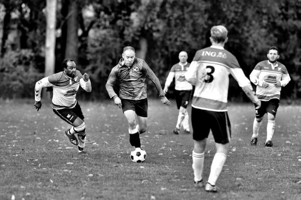 Zonder TJ, die nog steeds met zijn trofee op de bank lag, werd menig kans om zeep geholpen maar door Herman, Tebbens en PK werd wel doeltreffend afgerond. Verdedigend werd afgezien van een verdwaalde en doeltreffende counter nagenoeg niets weggegeven zodat na 90 minuten een volwassen 3-1 op het scorebord stond. Leen z’n finest-hour brak toen aan; hij kreeg het felbegeerde speldje in verband met zijn 25-jarig lidmaatschap uitgereikt. Gefeliciteerd! Koert werd in de tussentijd door zijn geliefde afgevoerd vanwege een zweepslag. Net toen hij ‘druk’ wilde zetten en dat in woord en gebaar uitte ging het gruwelijk mis. Beterschap en de fruitmand is onderweg!